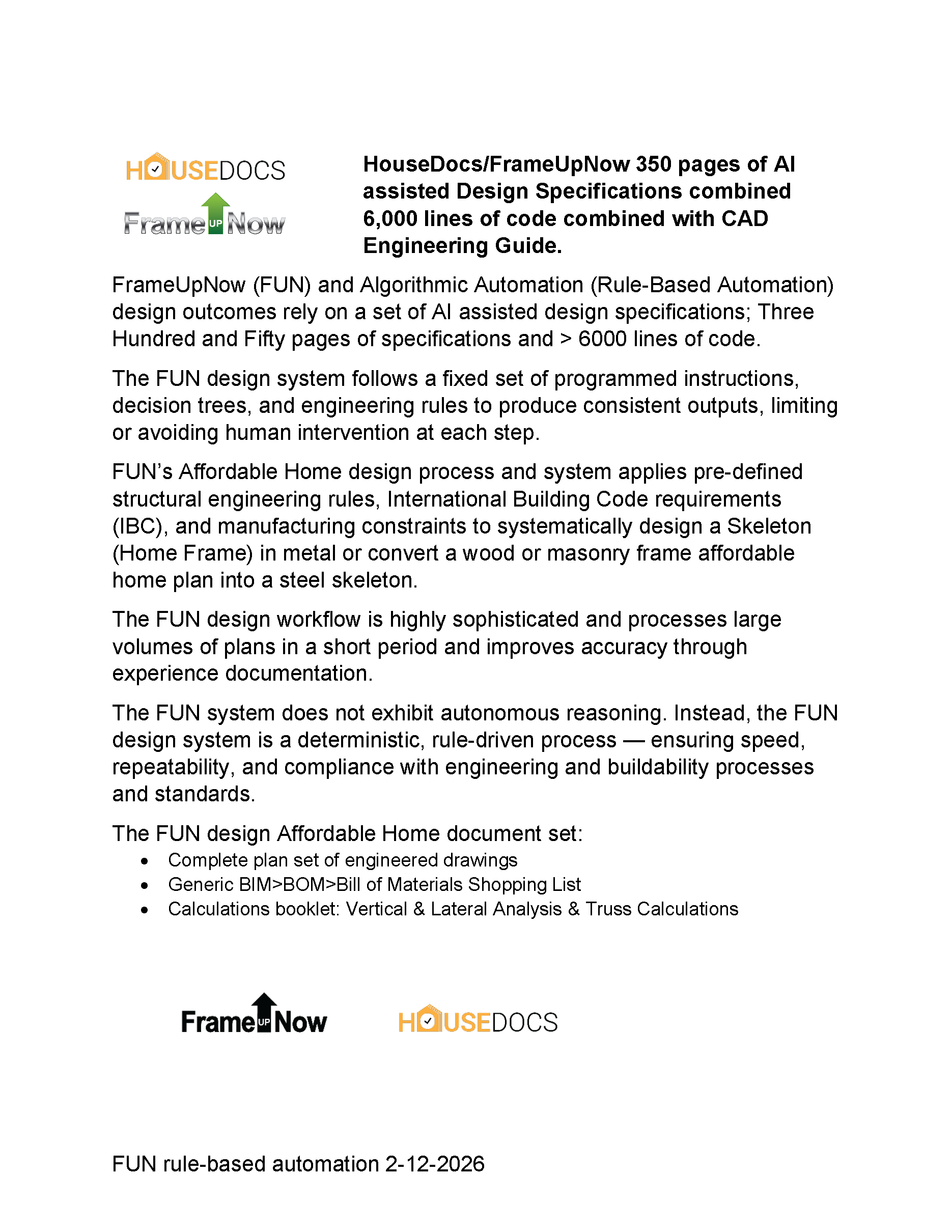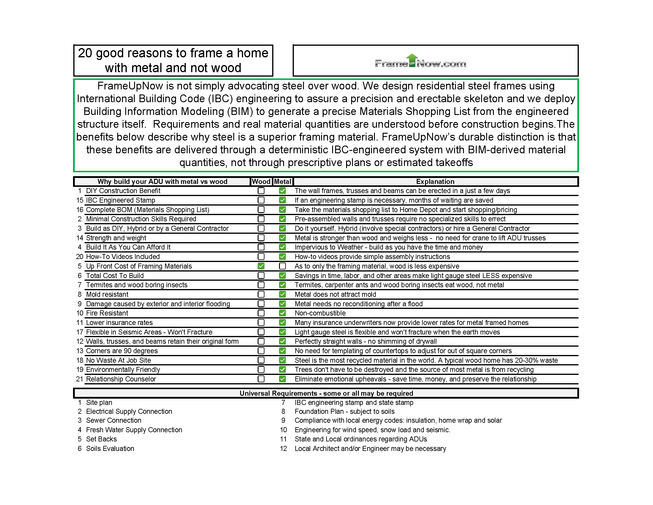 FrameUpNow is not simply advocating steel over wood. We design residential steel frames using International Building Code (IBC) engineering to produce a precise, erectable skeleton, and we apply Building Information Modeling (BIM) to generate a precise Materials Shopping List from the engineered structure itself—so structural requirements and real material quantities are understood before construction begins.