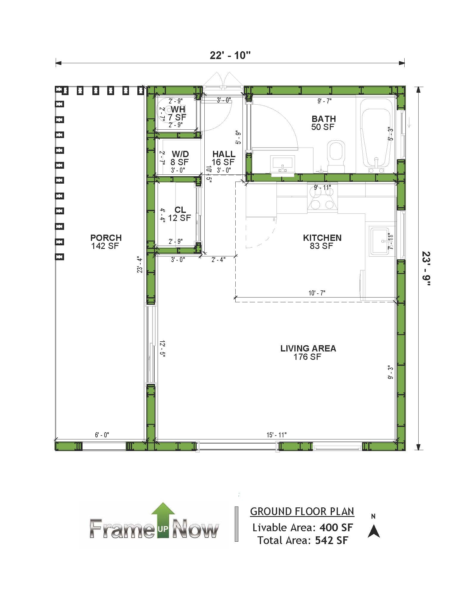 Total Area Under Roof: 542 SF