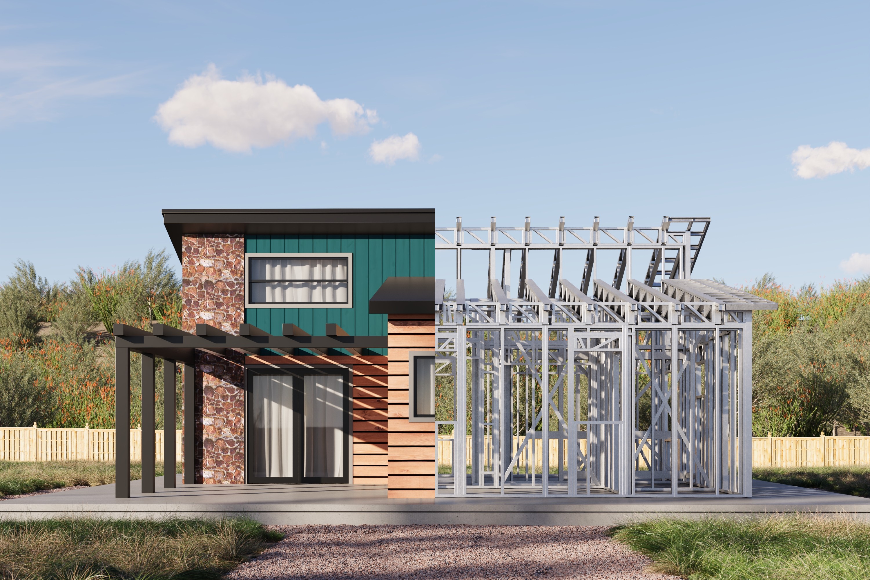 - Cold-Formed Steel Skeleton: Complete frame; wall panels, beams, trusses, and floor joists (if applicable)
