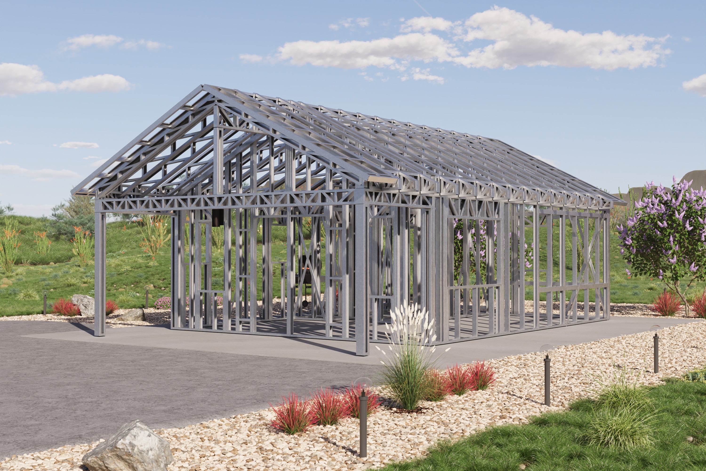 - Cold-Formed Steel Skeleton: Complete frame; wall panels, beams, trusses, and floor joists (if applicable)