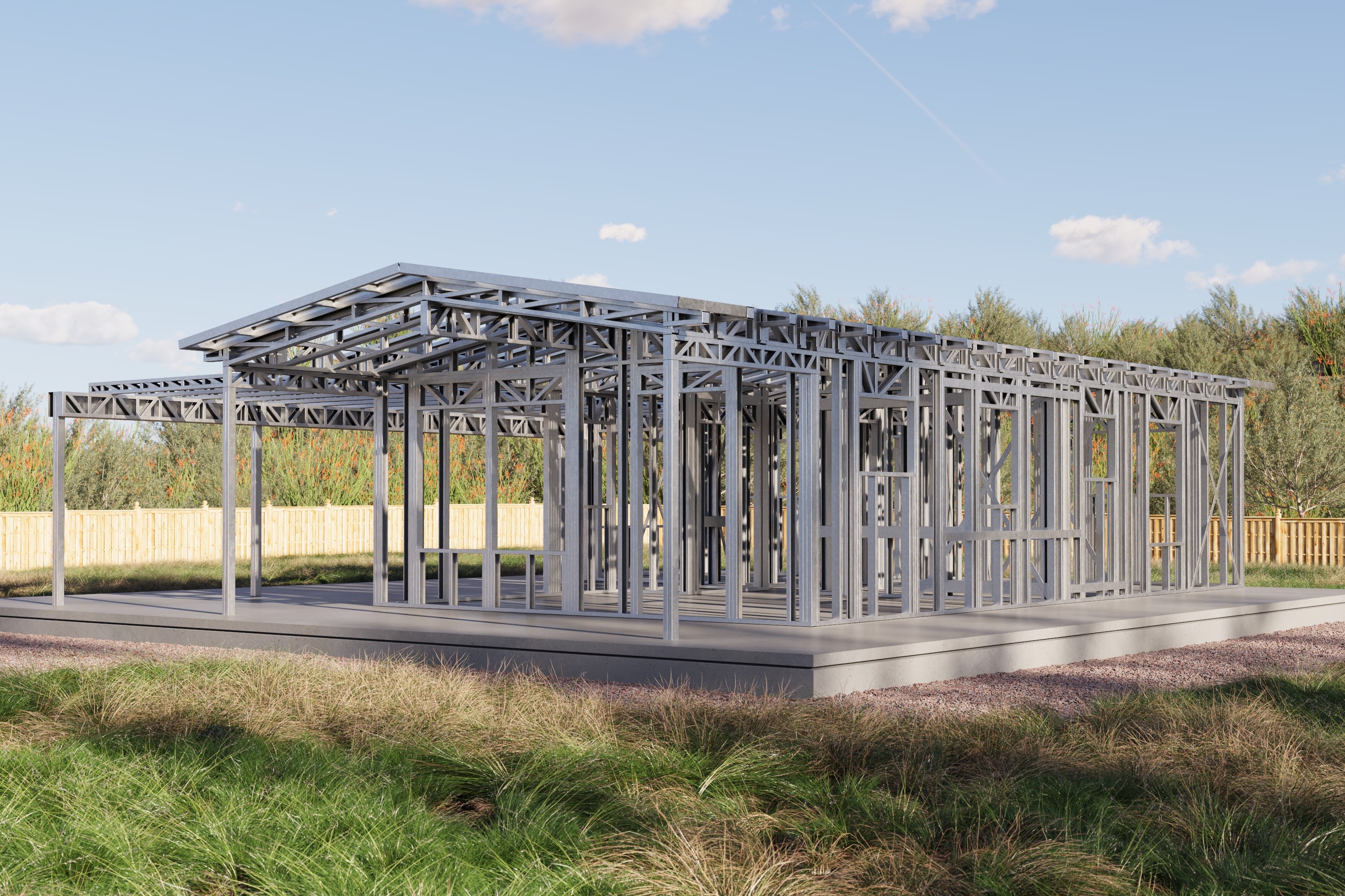 - Cold-Formed Steel Skeleton: Complete frame; wall panels, beams, trusses, and floor joists (if applicable)