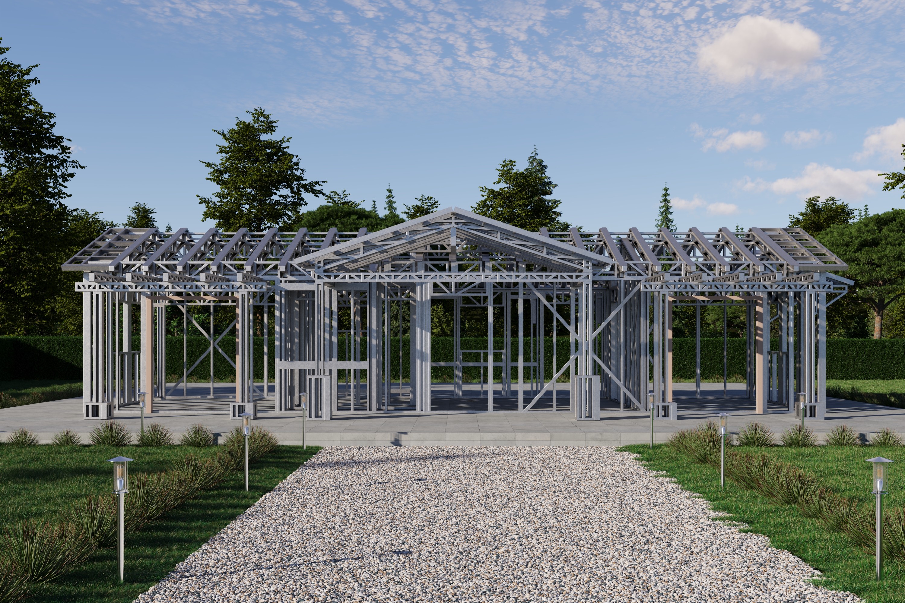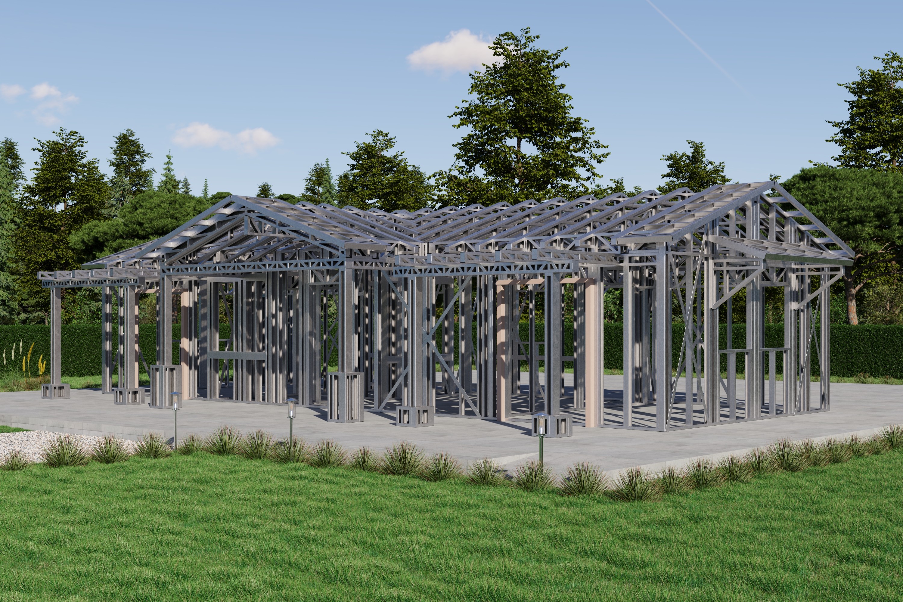- Cold-Formed Steel Skeleton: Complete frame; wall panels, beams, trusses, floor joists (if applicable), fasteners, and hardware for you to erect your skeleton.