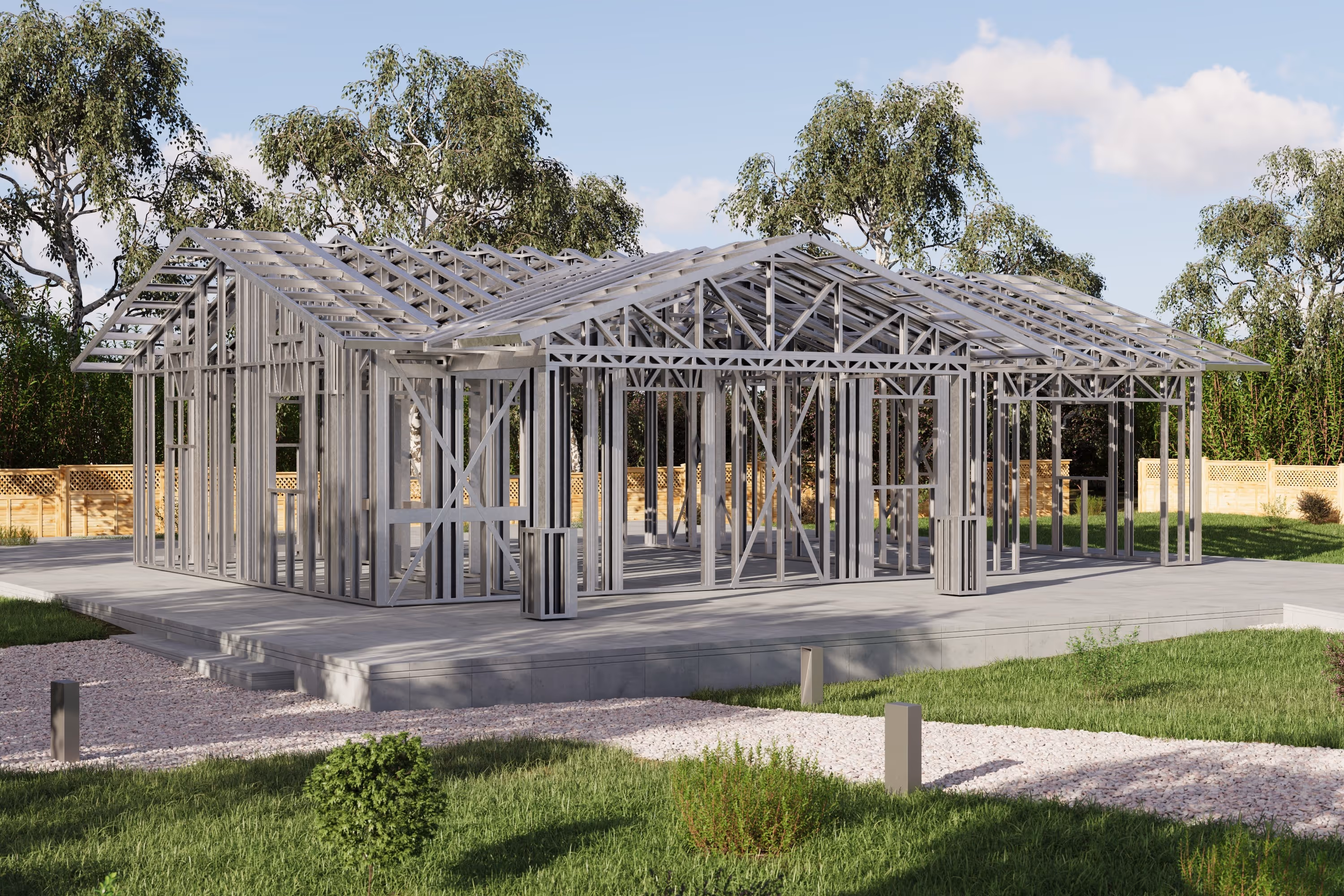- Cold-Formed Steel Skeleton: Complete frame; wall panels, beams, trusses, floor joists (if applicable), fasteners, and hardware for you to erect your skeleton.