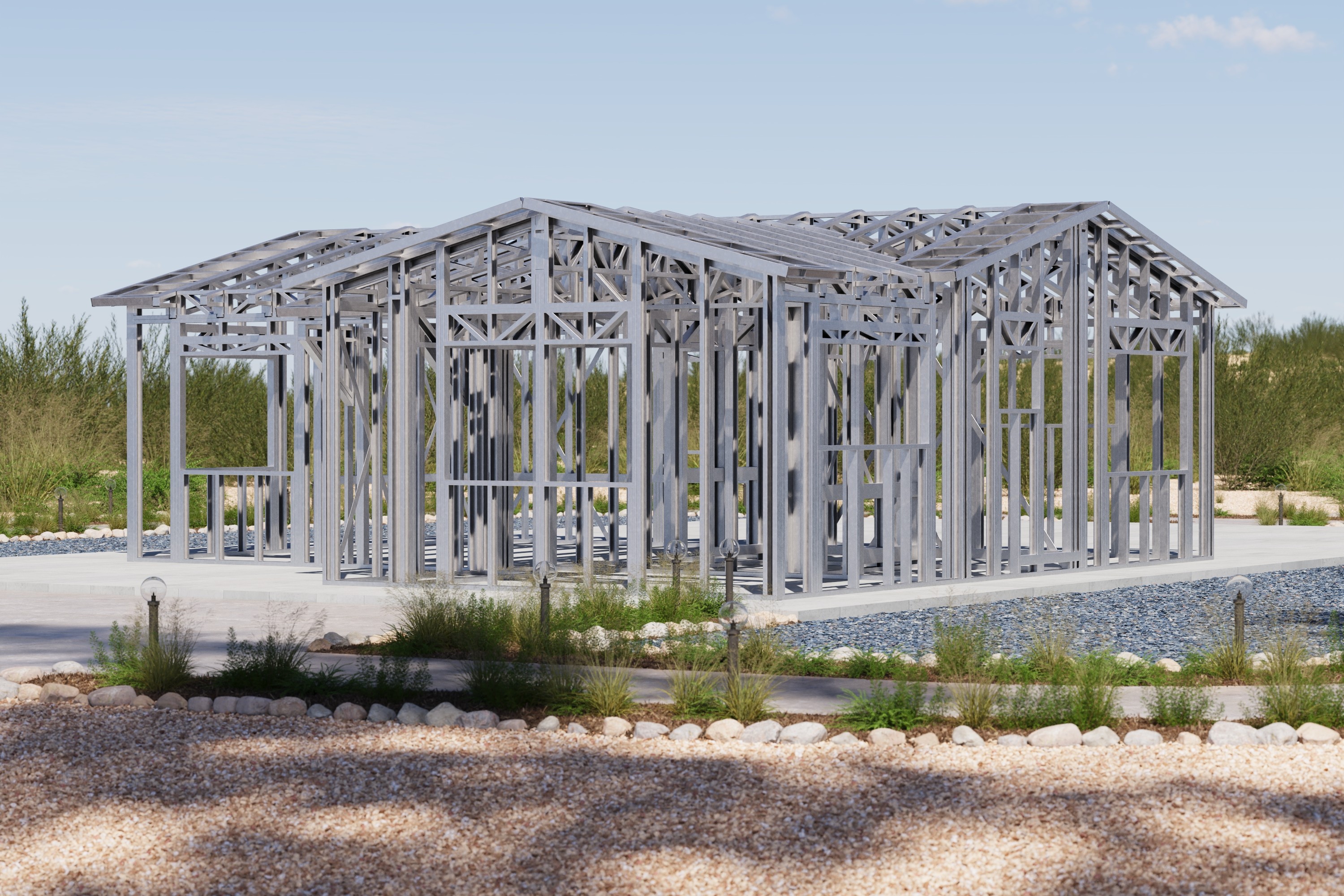- Cold-Formed Steel Skeleton: Complete frame; wall panels, beams, trusses, floor joists (if applicable), fasteners, and hardware for you to erect your skeleton.