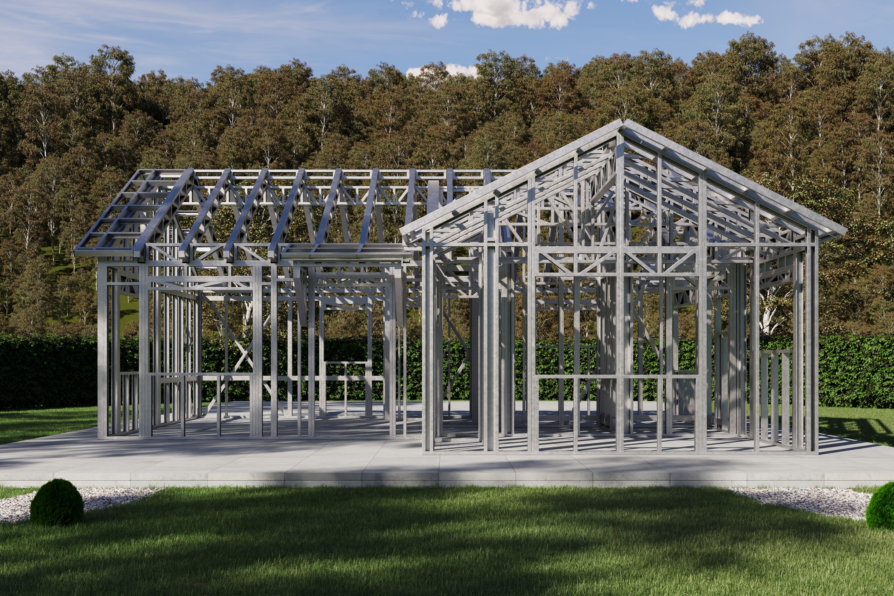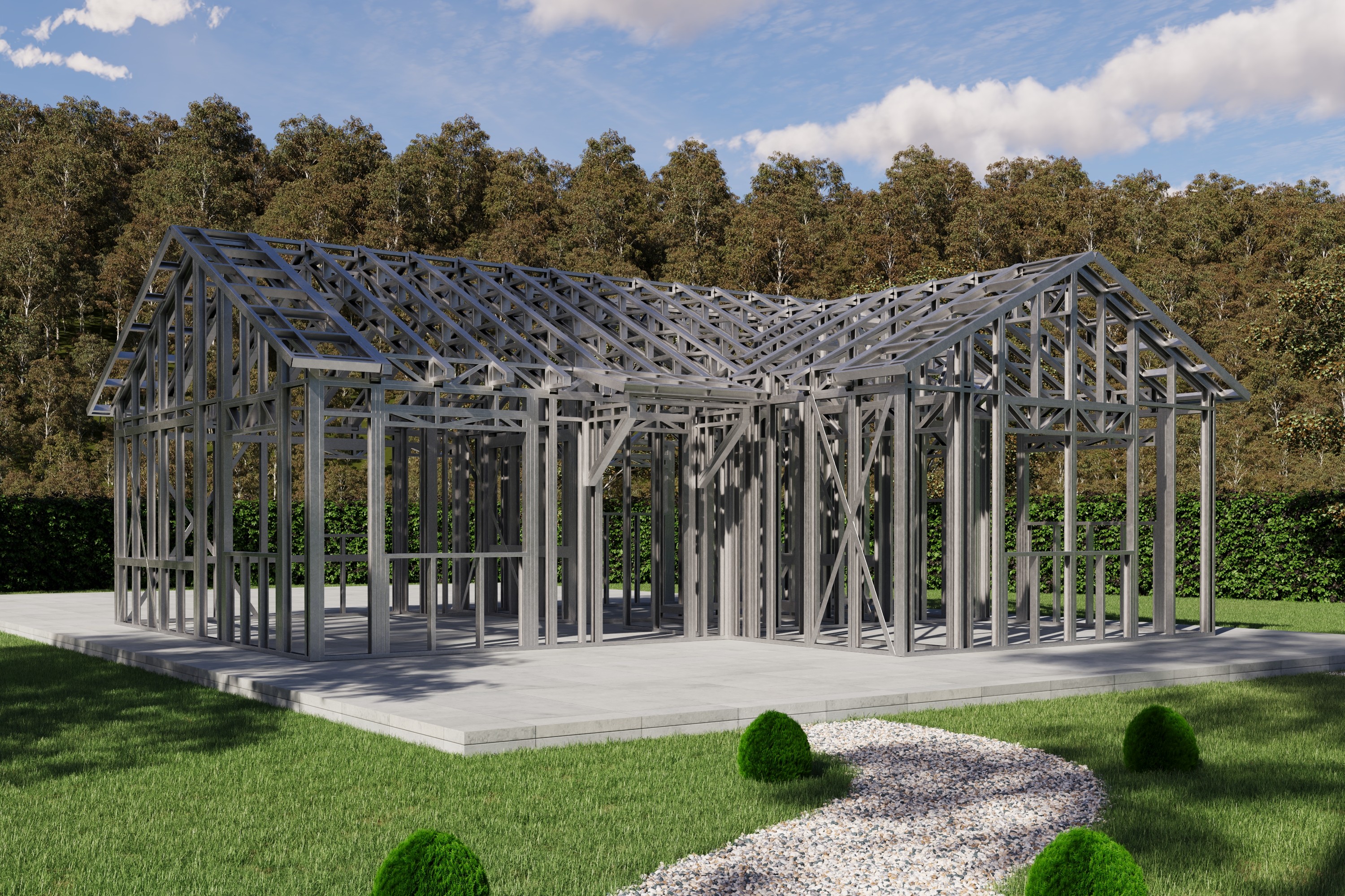 - Cold-Formed Steel Skeleton: Complete frame; wall panels, beams, trusses, floor joists (if applicable), fasteners, and hardware for you to erect your skeleton.